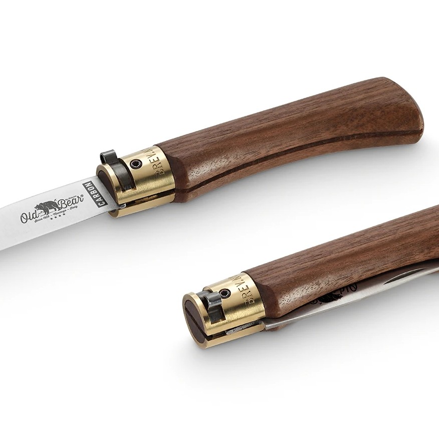Srednji M (Medium) model iz Antonini Old Bear serije tradicionalnih sklopivih džepnih noževa u 5 veličina sa rukohvatom od drva oraha. Sječivo dužine 8 cm i ukupne otvorene dužine 19 cm. Vrlo mala težina od samo 44 grama neprimjetna za nošenje u džepu. 100% čista klasika uz klasičan visokougljični opružni čelik C67 termički obrađen na 55 HRc. koji se lako oštri na visoku oštrinu ali nije otporan na koroziju i zahtjeva povremeno čišćenje, uljenje i poliranje.