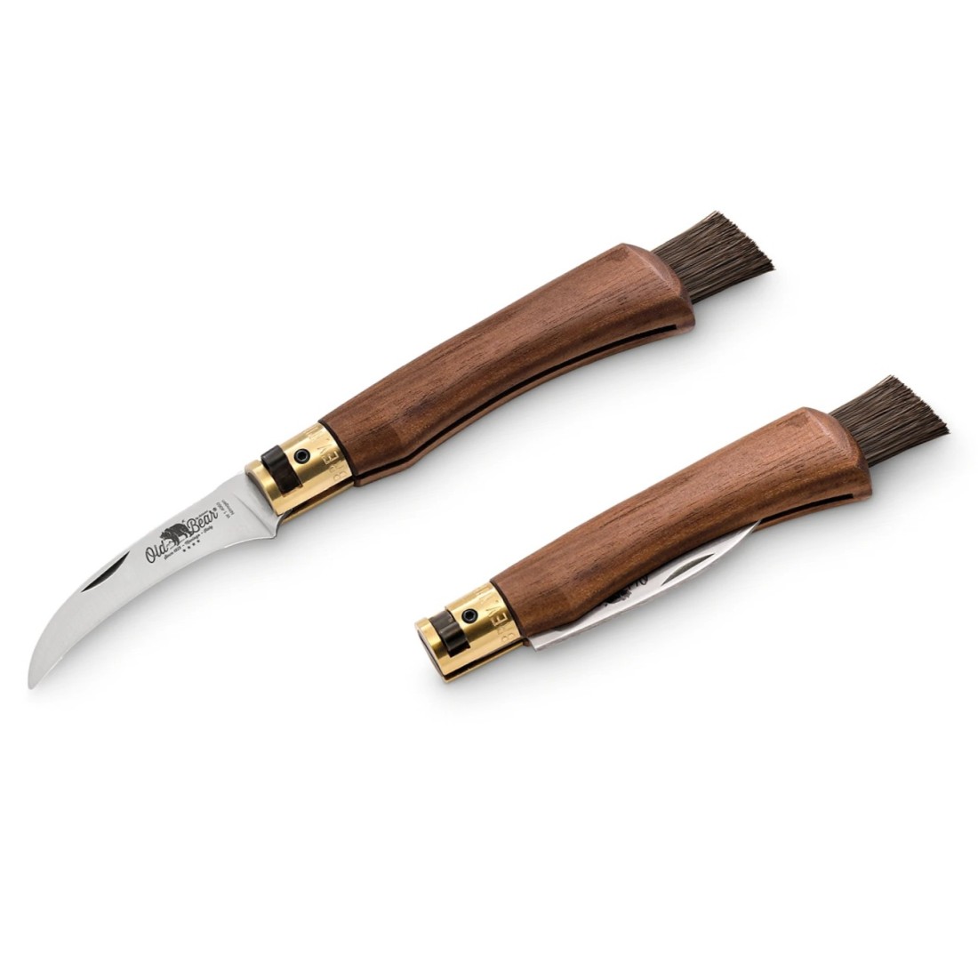 Old Bear linija Mushroom noževa za gljive talijanske tvrtke Antonini posebno je dizajnirana za branje gljiva. To se odražava u obliku oštrice i četkicom za nježno čišćenje gljiva na dršci. Oštrica je izrađena od visokokvalitetnog nehrđajućeg čelika W.1.4060 s dušikom za oštrinu, čvrstoću i otpornost na koroziju. Ergonomska drška izrađena je od nauljenog oraha i tijekom svog vijeka trajanja razvit će prirodnu patinu. Mushroom nož ima Ring-Lock; ova mesingana brava čvrsto drži oštricu na mjestu, bilo da je sklopljena ili otvorena. Brava također ima mali Torx T8 vijak (odvijač uključen) koji vam omogućuje podešavanje jačine stezanja oštrice, omogućujući vam da savršeno prilagodite nož svojim željama. Četkica na stražnjoj strani drške izrađena je od 20 mm duge prave konjske dlake i idealna je za čišćenje svježe ubranih gljiva.