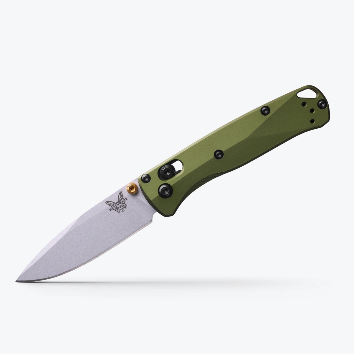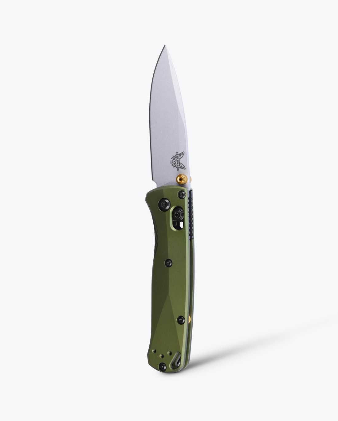 The 533SL-10 Mini Bugout® features earthy, Woodland Green anodized aluminum handle scales, a fresh outdoor hue inspired by the vintage camping gear and cookware you might recognize back at basecamp. With the same slim, ergonomic and compact profile as normal Mini’s, we advanced materials beyond the handle, building the 533SL-10 with a premium S90V stainless steel blade with a Crushed Silver Cerakote® finish, and a pop of color, found in its gold anodized thumb stud and barrel spacer.
